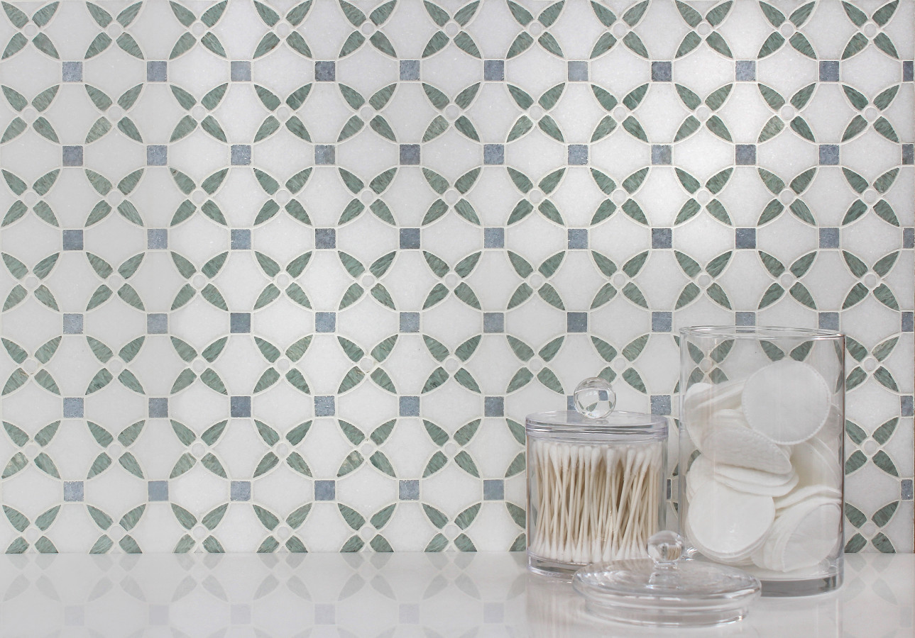 - Olynthos Blue Celeste, Ming Green, And Thassos Standard 12×12 Bellamy Mosaic