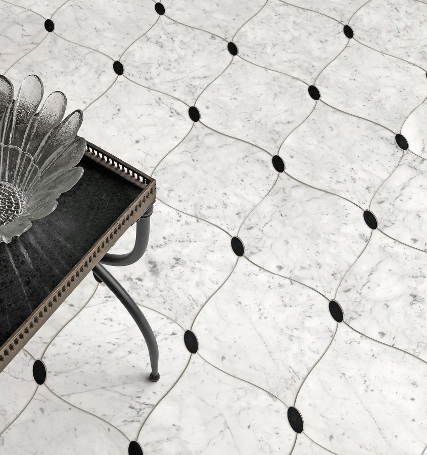 - Olynthos Carrara And Nero Marquina 11×11 Chelsea Mosaic